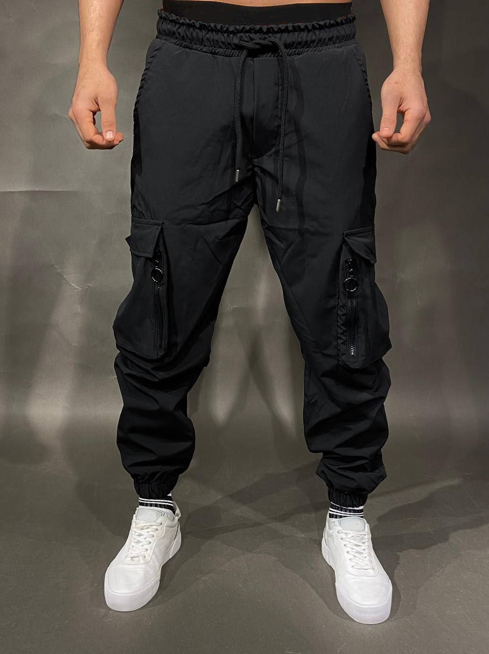 Ανδρικό παντελόνι cargo με τσέπες στα μπατζάκια στο πλάι και λάστιχο στη μέση και στα πόδια